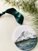 Ornament measures 3.5" x 3.5" (Circle) and hangs from a satin ribbon, varying colors to complement the art map.