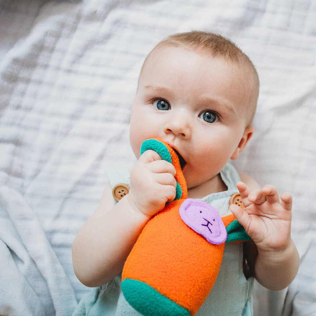 This soft creature rattle is the perfect toy to entertain your little one. It makes a small rattling sound with each shake and is ideal for snuggling and teething. Made from fleece fabric, hypo-allergenic fiberfill, and a commercial-grade rattle. Just like all of our creatures, this rattle can be machine washed and tumble dried on a low setting. Measures approximately 5.5" tall and 2.5" wide.