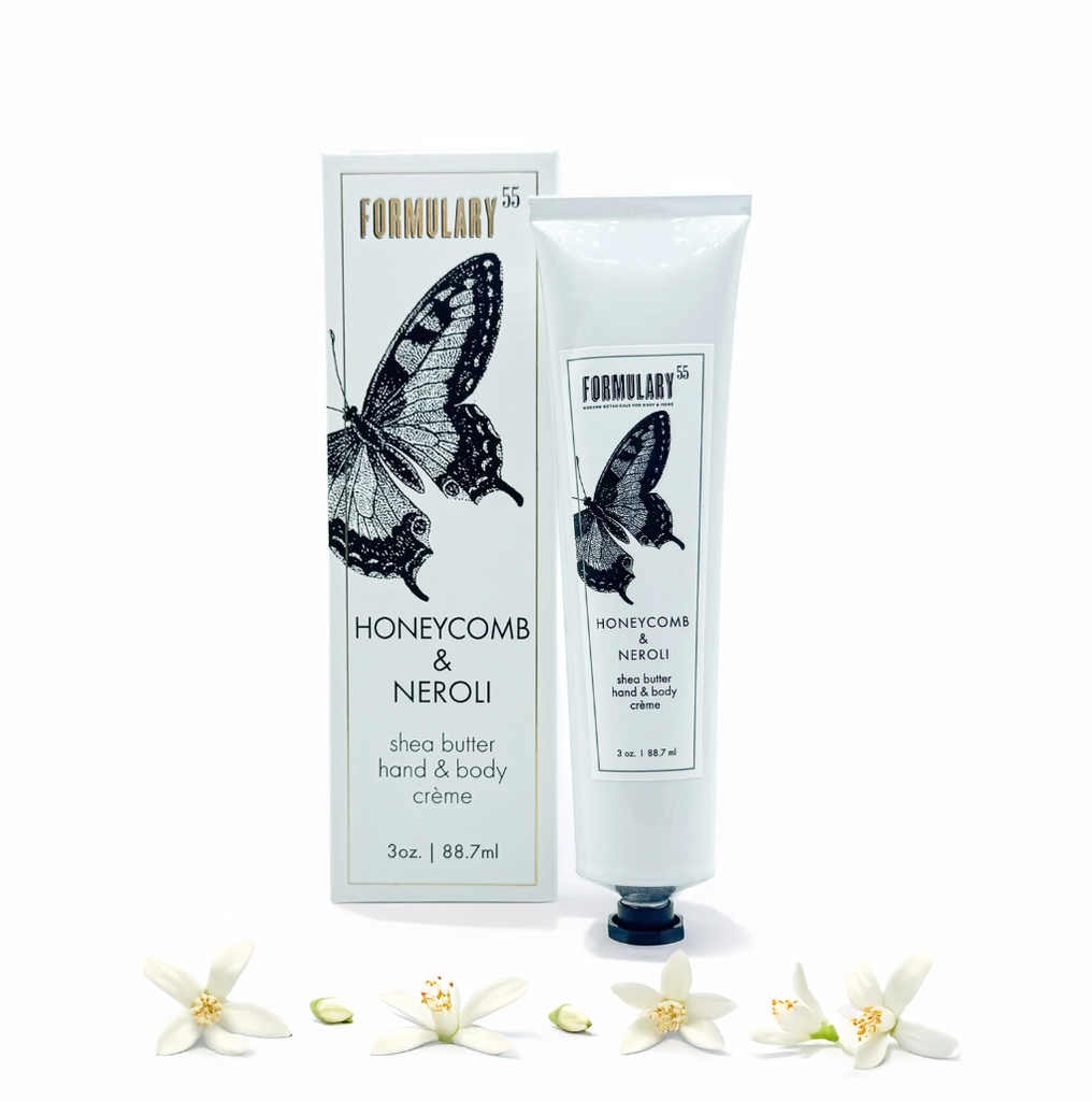 Honeycomb & Neroli hand and body creme is now in a convenient size that's TSA carry-on approved and perfect for customers who want to take their favorite scents 'on-the-go. Each tube comes elegantly packaged in a gift box designed specifically for its fragrance, featuring the signature black and white botanical designs that define the Formulary 55 aesthetic.